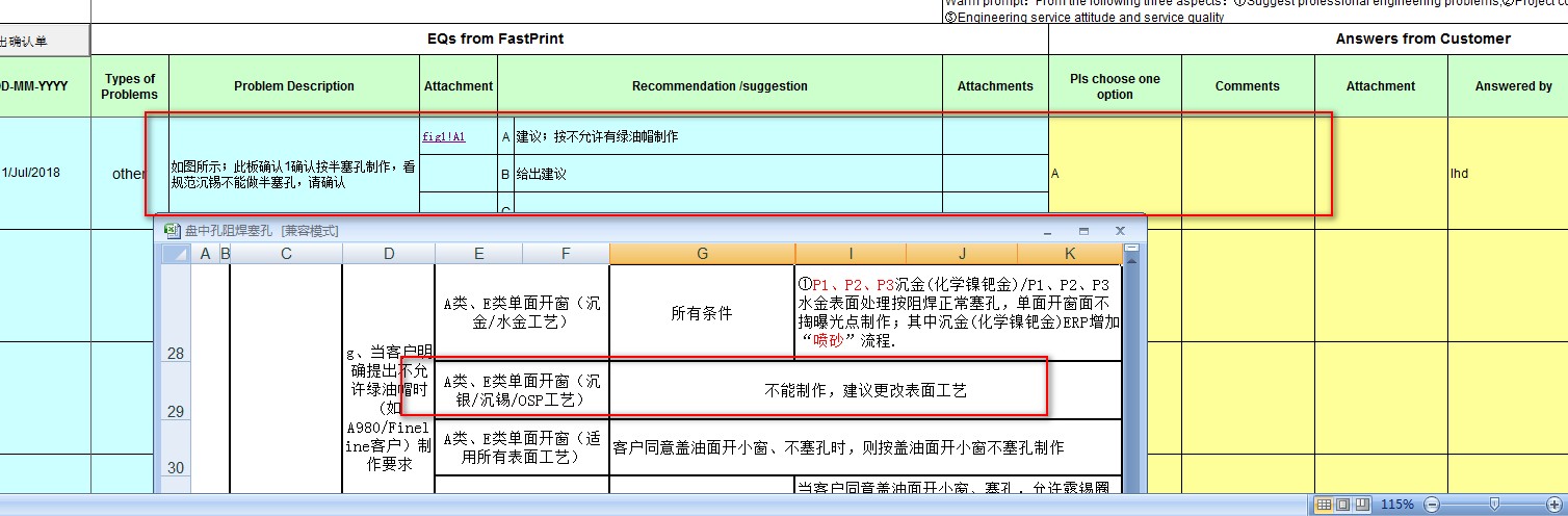 2018/7/2 17:52 171691 半塞孔的目的就是防止绿油冒的,此板沉锡,做不了半塞,也不能按没有绿油冒的做法,只能确认按常规评审的做法,确认接受孔内藏药水,单边开窗不掏曝光点,现在资料是按小3MIL掏负量的.jpg